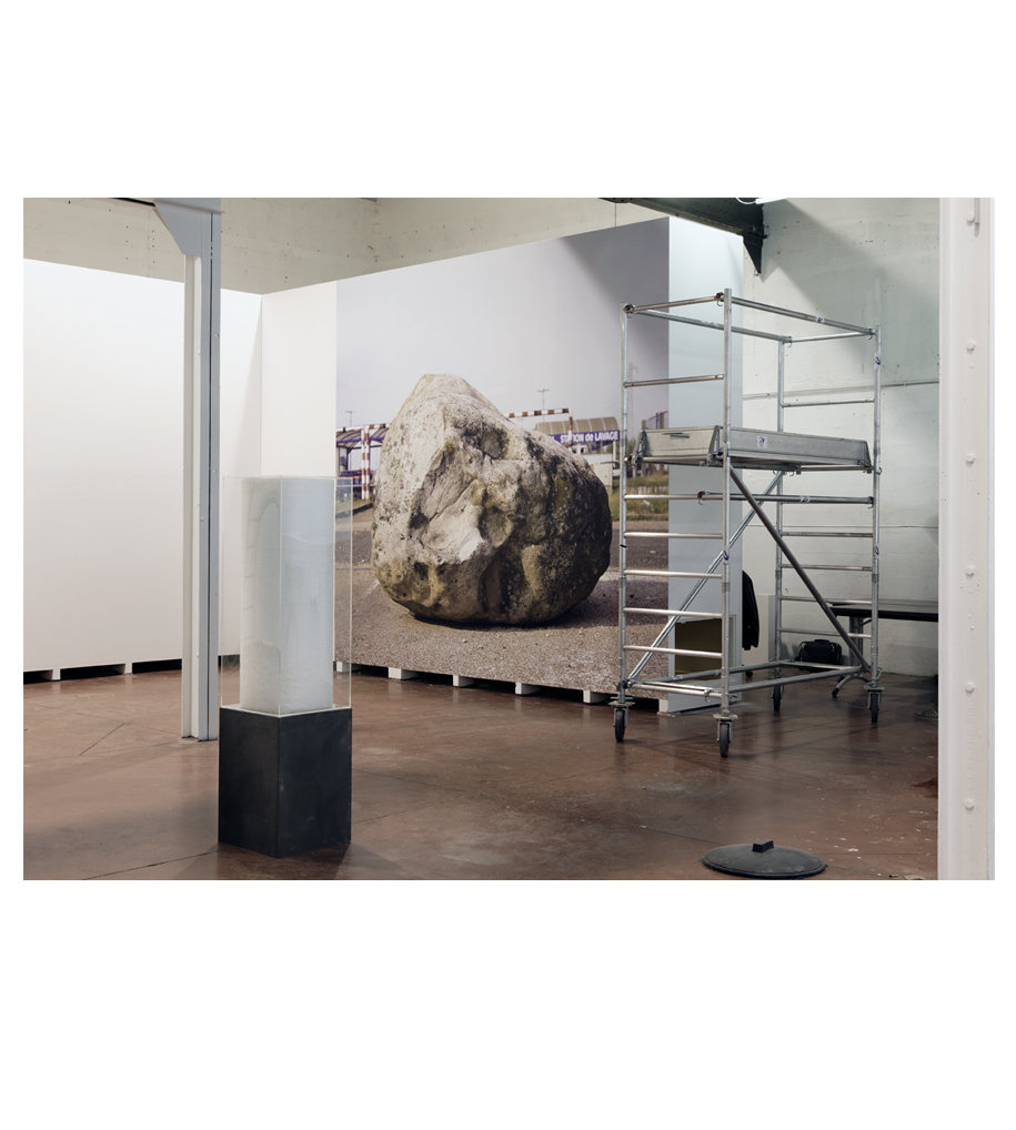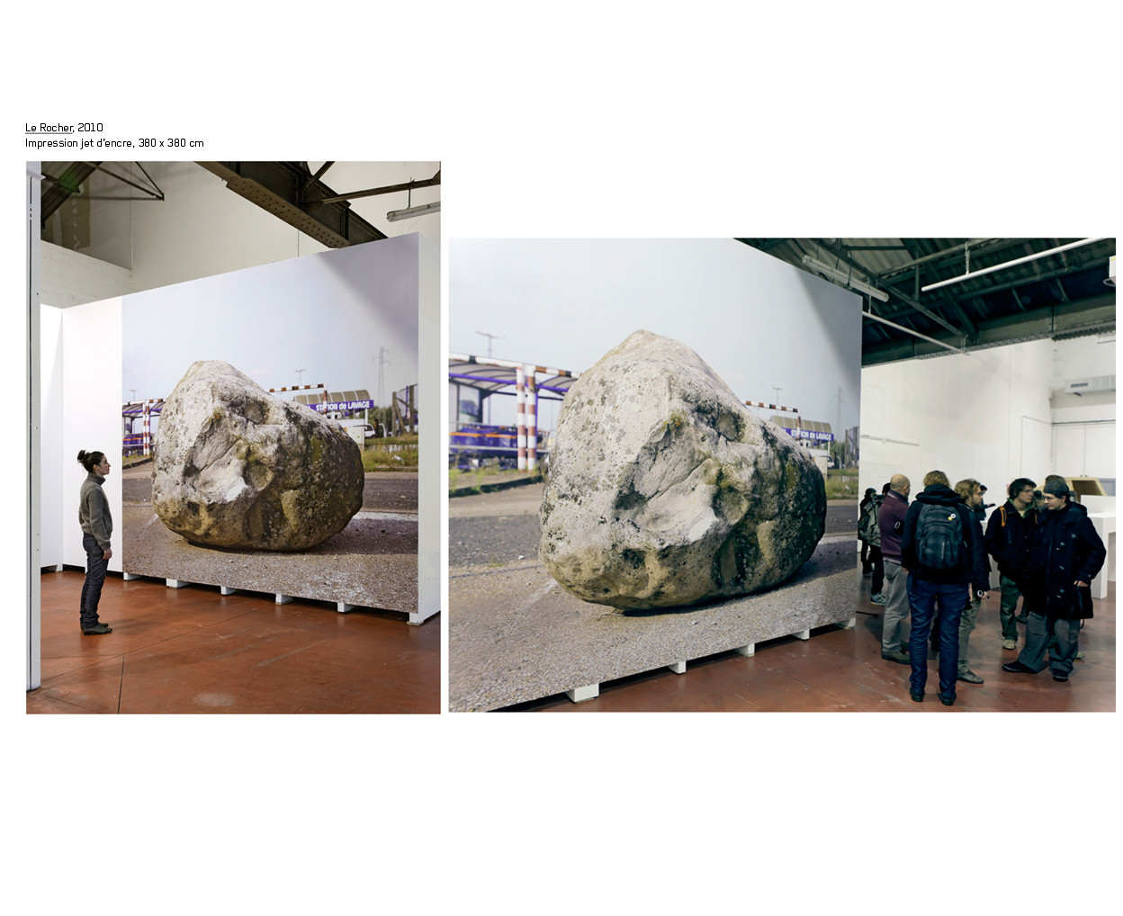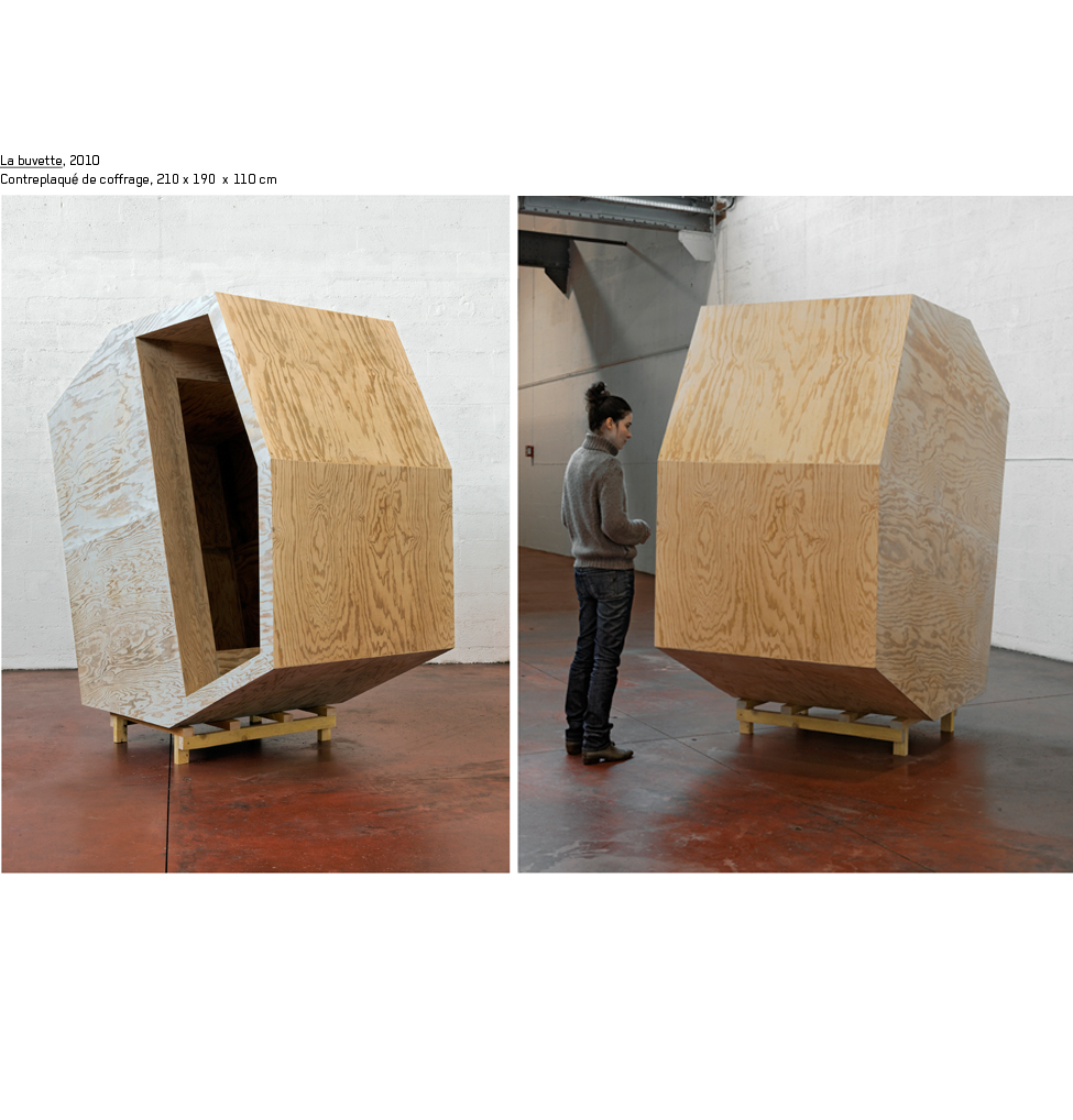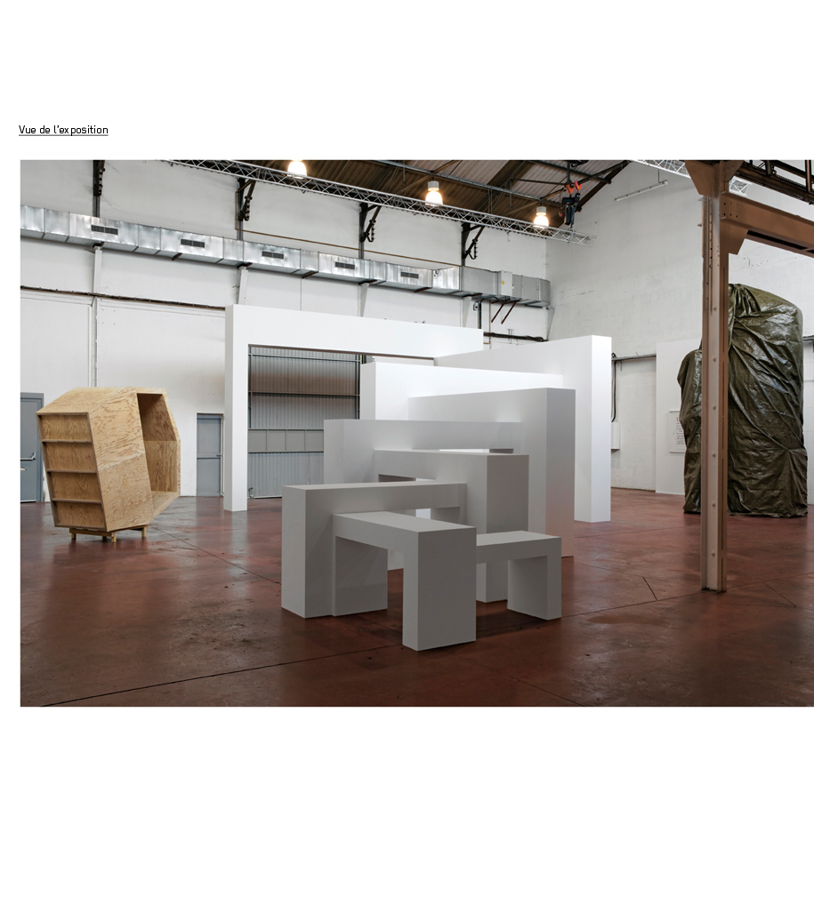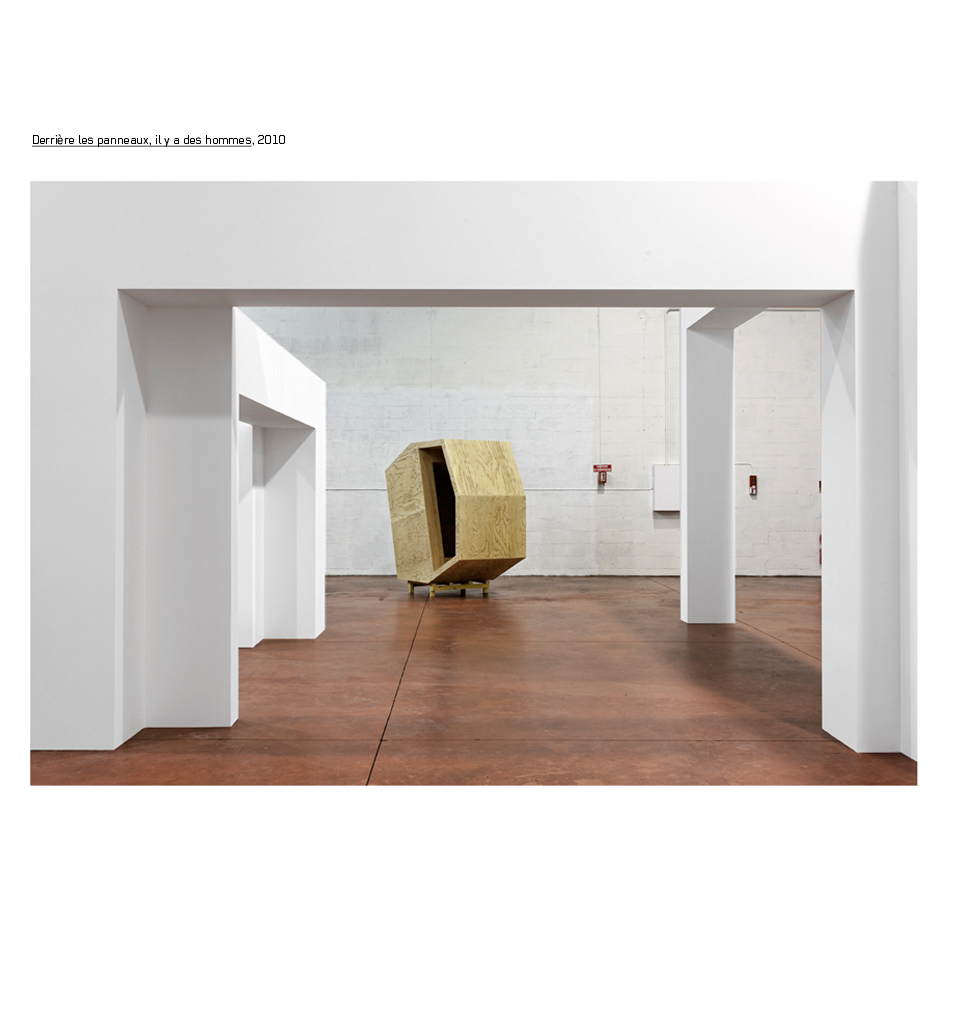 Certaines pièces sont ainsi à peine sorties de leur caisse, quand d’autres sont encore emballées, ou posées à même le sol. Des cimaises apparaissent incomplètes alors que des passages de circulation sont curieusement obstrués. Derrière les panneaux, il y a des hommes, repose sur cette équivoque, entre provisoire et suspension, entre instabilité et équilibre.