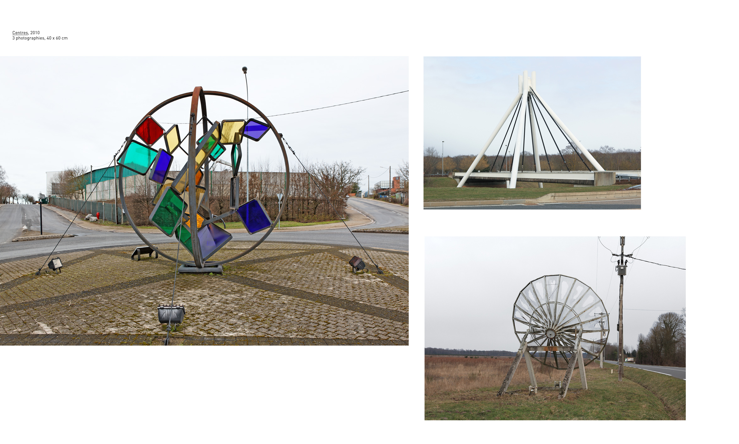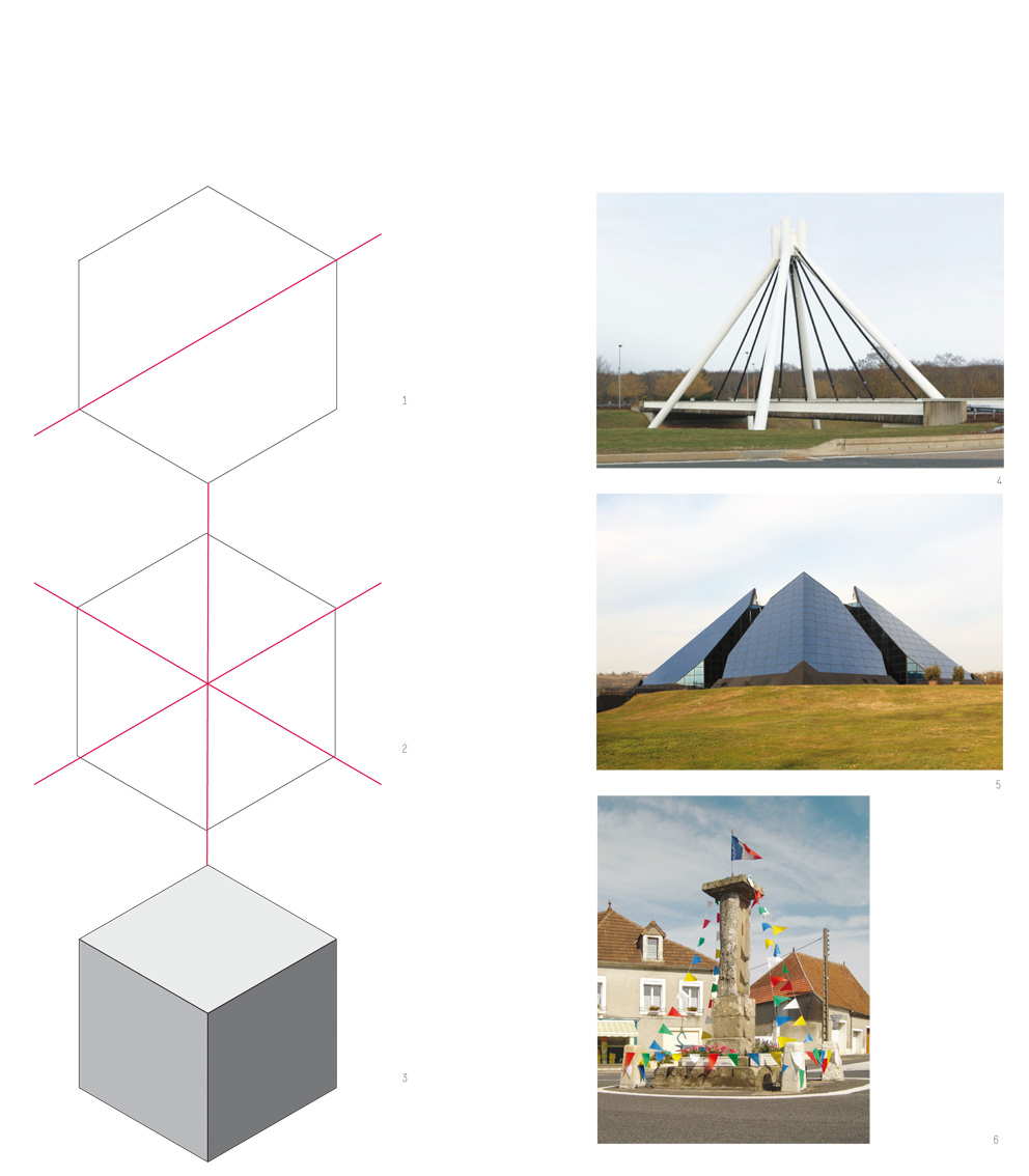 Venant de Paris par l’autoroute 71, je passe sous cet ouvrage incongru (4) qui signale au voyageur fatigué l’Aire de repos du Centre de la France. Tel un axe sur lequel reposerait en équilibre l’hexagone (2), ce monument fait par ailleurs office de passerelle permettant d’enjamber la diagonale du vide (1) et c’est vrai que penché sur le garde-fou, on est pris de vertige. Mais le Centre, l’unique, celui que je suis venu voir, se trouve à quelques kilomètres de là. Pour m’y rendre, je quitte la A 71 en direction de St Amand-Montron où, à la sortie de la bourgade, se dresse cet édifice remarquable de prétention (5) “Le Diamant Noir“ tel qu’on le surnomme parfois dans la région - et dont je ne peux que relever les complémentarités structurelles et formelles avec celui cité précédemment. St Amand offre par ailleurs quelques autres curiosités qui, je pense, valent le détour. Mais là n’est pas le propos.